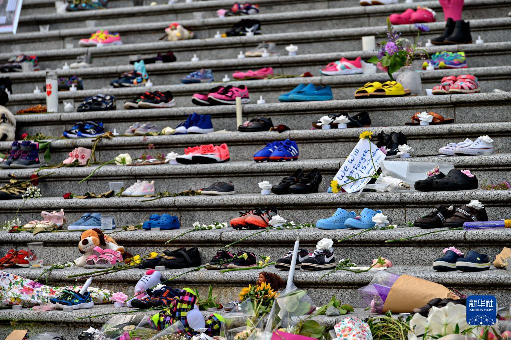 2021年5月30日,在加拿大不列颠哥伦比亚省温哥华,人们摆放鲜花、鞋子悼念寄宿学校的死难儿童。2021年5月下旬,加拿大原住民在不列颠哥伦比亚省“坎卢普斯印第安寄宿学校”旧址发现了215具无名儿童遗骸,震惊加拿大和国际社会。