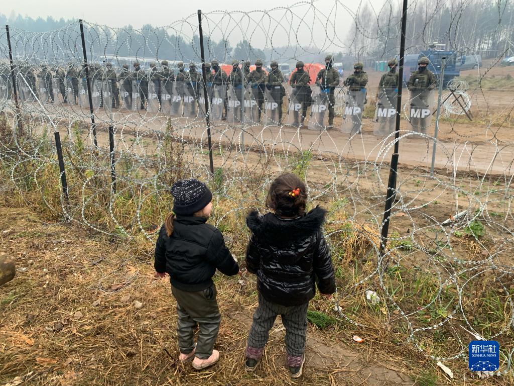 2021年11月14日,在白俄罗斯靠近波兰边境的一处难民点,两名儿童透过边境线上的铁丝网遥望波兰一侧的军人。