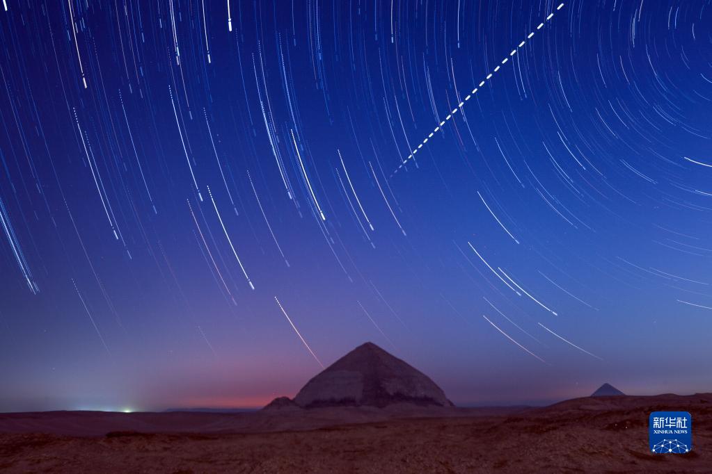2021年11月26日在埃及首都开罗以南的弯曲金字塔附近拍摄的照片显示,中国空间站划过夜空(轨迹为多张照片堆栈)。2021年10月16日,神舟十三号载人飞船成功发射,开启中国迄今时间最长的载人飞行。3名航天员将在中国天宫空间站核心舱在轨驻留6个月。