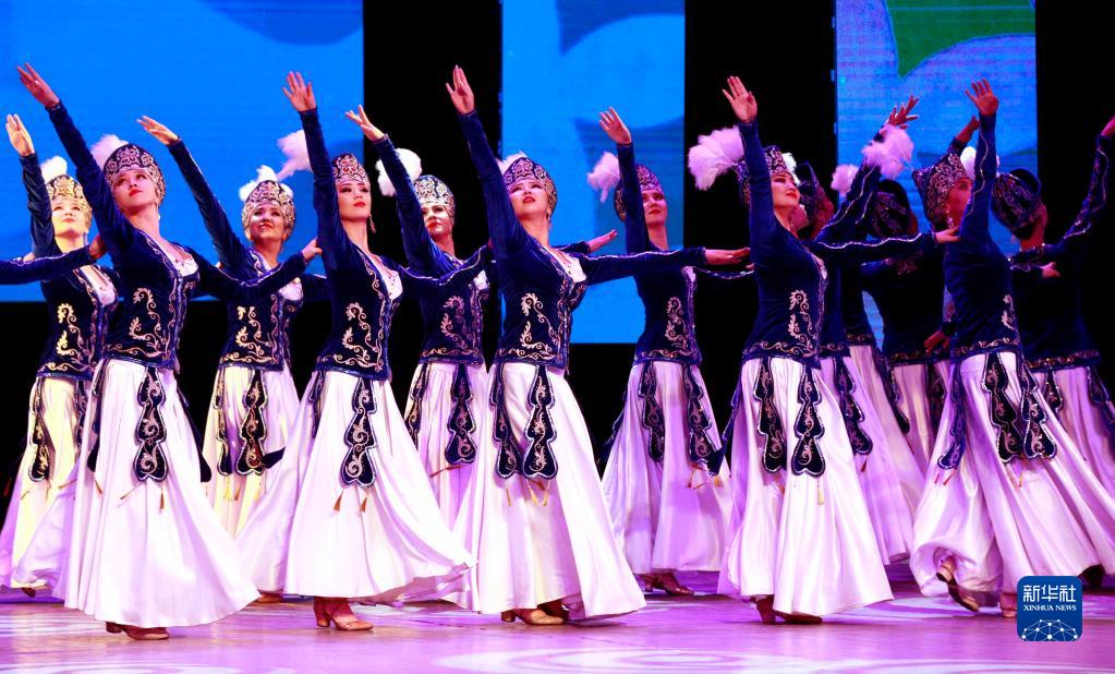 1月5日,在吉尔吉斯斯坦首都比什凯克,演员在庆祝中吉建交30周年文艺晚会上表演民族舞蹈。新华社发(罗曼摄)