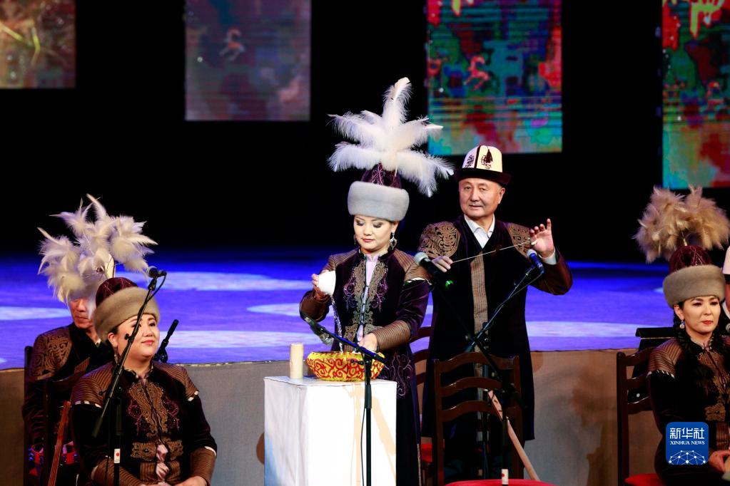 1月5日,在吉尔吉斯斯坦首都比什凯克,演员在庆祝中吉建交30周年文艺晚会上演奏民族乐器。新华社发(罗曼摄)