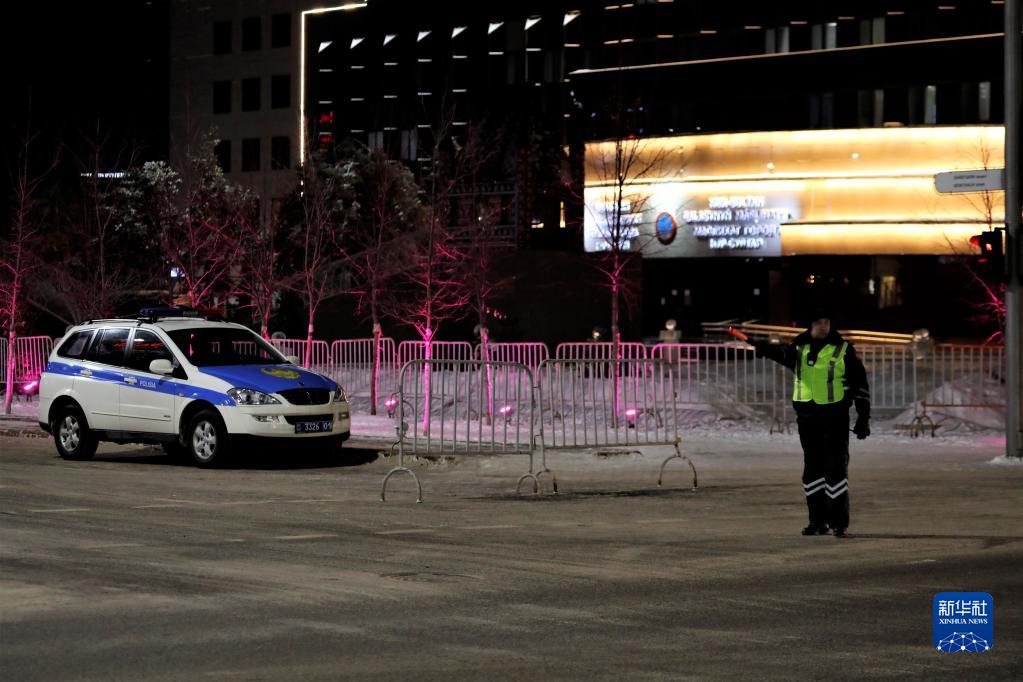 1月5日,警察在哈萨克斯坦首都努尔苏丹的市政府前执勤。