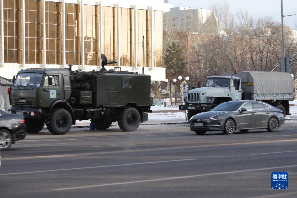 1月6日,军用车辆在哈萨克斯坦首都努尔苏丹的主要街道执勤。