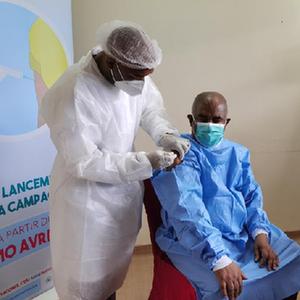 2021年4月10日,科摩罗总统阿扎利(左二)在首都莫罗尼北部的埃尔·马鲁夫医院接种由中国国药集团生产的新冠疫苗。新华社发(韩林摄)