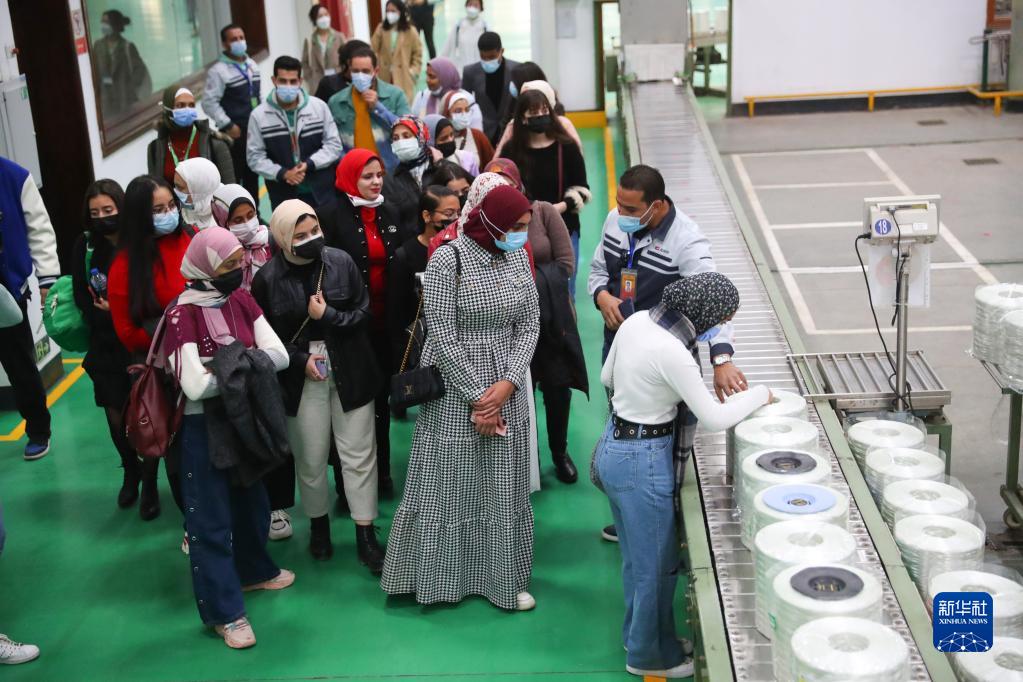 2021年12月30日,在位于埃及苏伊士省的中国巨石埃及玻璃纤维股份有限公司,学生参观玻璃纤维生产厂房。新华社记者 隋先凯 摄