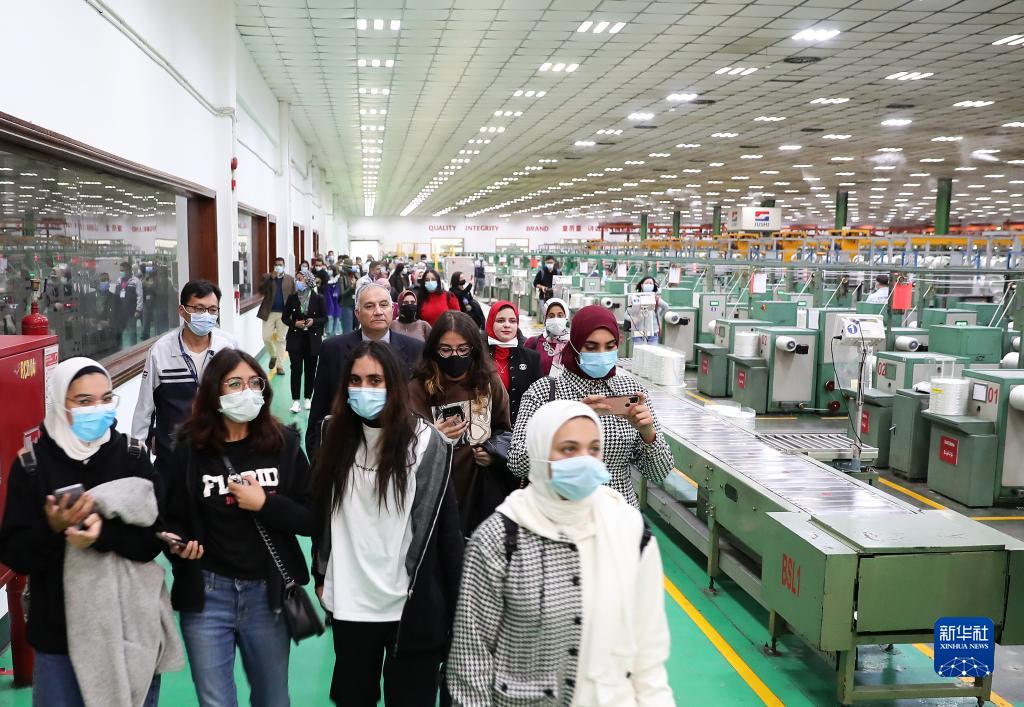 2021年12月30日,在位于埃及苏伊士省的中国巨石埃及玻璃纤维股份有限公司,学生参观玻璃纤维生产厂房。新华社记者 王东震 摄