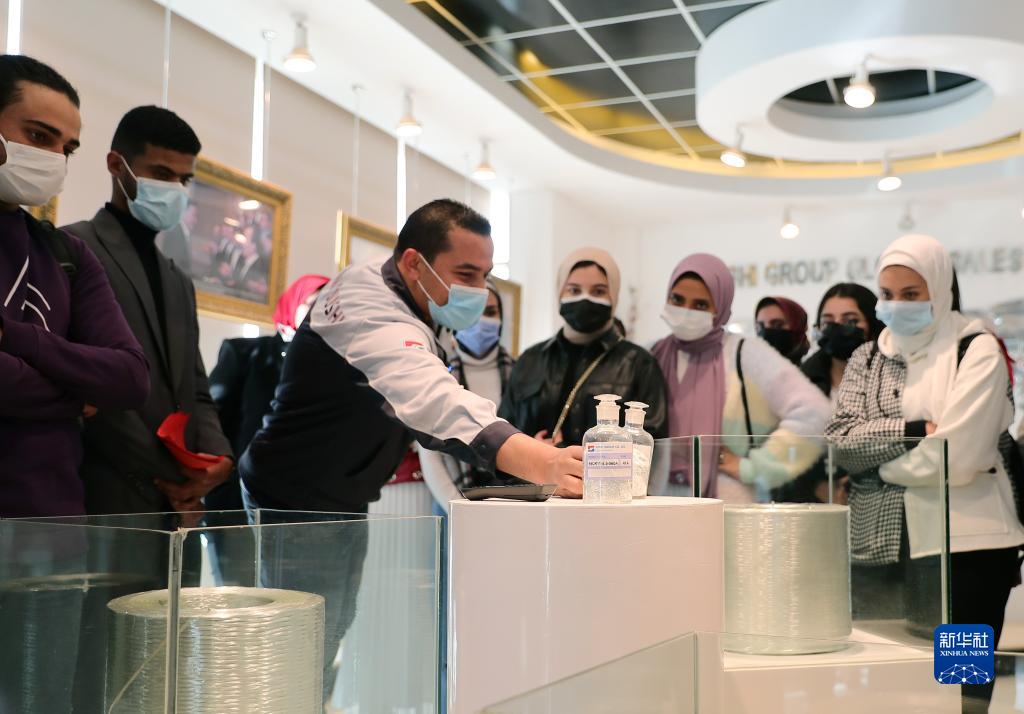 2021年12月30日,在位于埃及苏伊士省的中国巨石埃及玻璃纤维股份有限公司,学生参观展厅。新华社记者 王东震 摄