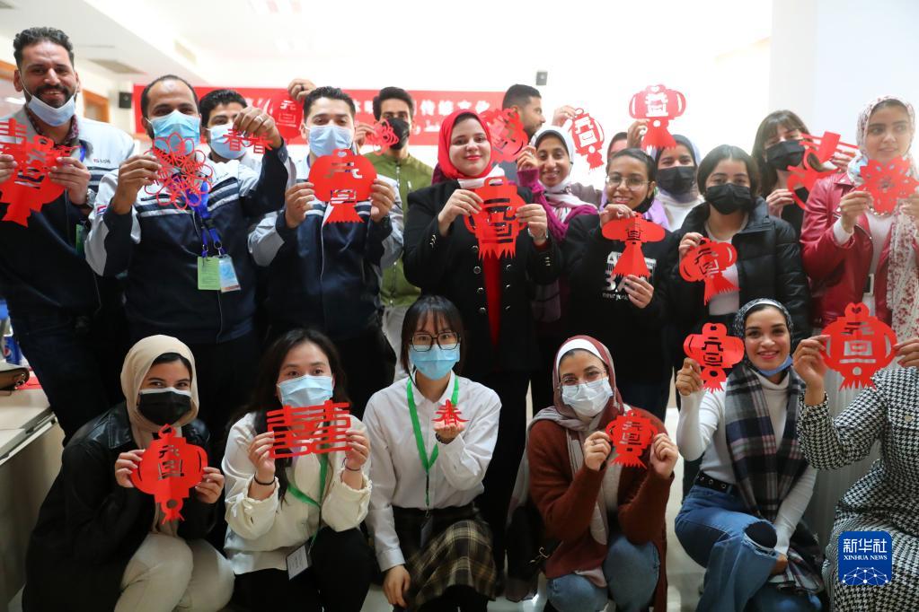 2021年12月30日,在位于埃及苏伊士省的中国巨石埃及玻璃纤维股份有限公司,参观该公司的埃及学生和公司员工在文化交流活动期间展示自己的剪纸作品。新华社记者 隋先凯 摄