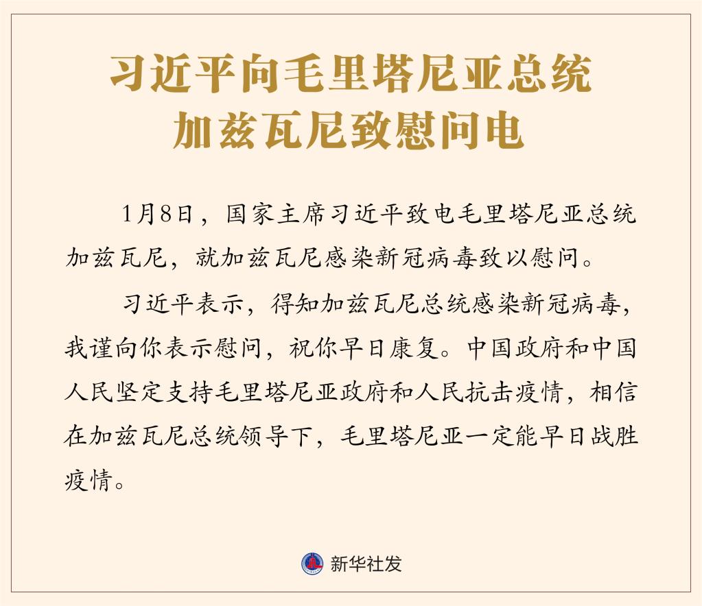 新华社北京1月8日电  1月8日,国家主席习近平致电毛里塔尼亚总统加兹瓦尼,就加兹瓦尼感染新冠病毒致以慰问。