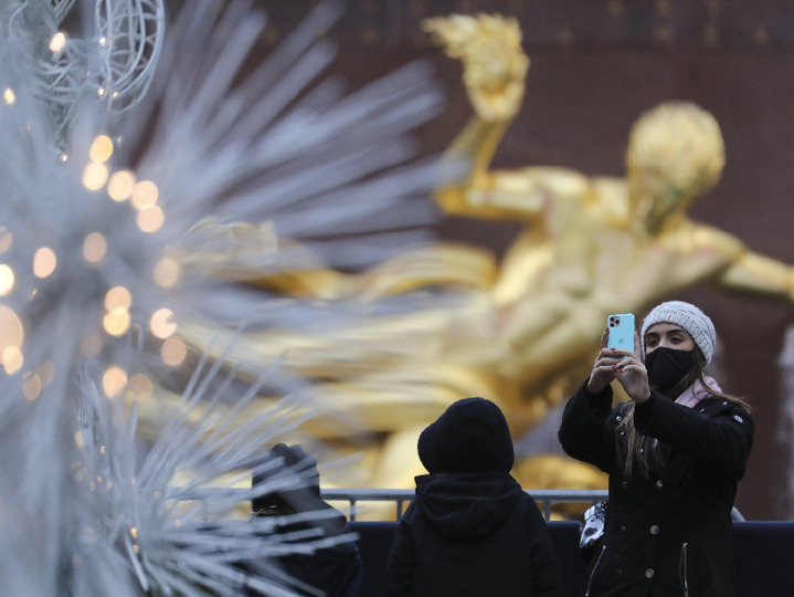 ↑2022年1月4日,一名戴口罩的女子在美国纽约洛克菲勒中心观光。新华社记者 王迎 摄