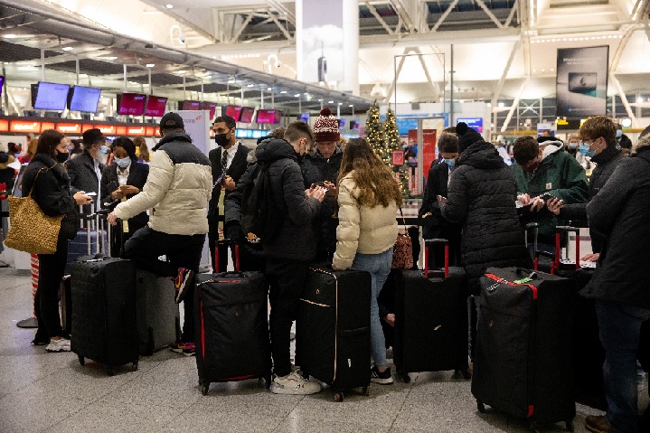↑2022年1月3日,一些旅客聚集在美国纽约肯尼迪国际机场4号航站楼。受疫情和天气情况影响,美国近期有数以千计航班被取消。新华社发(郭克摄)