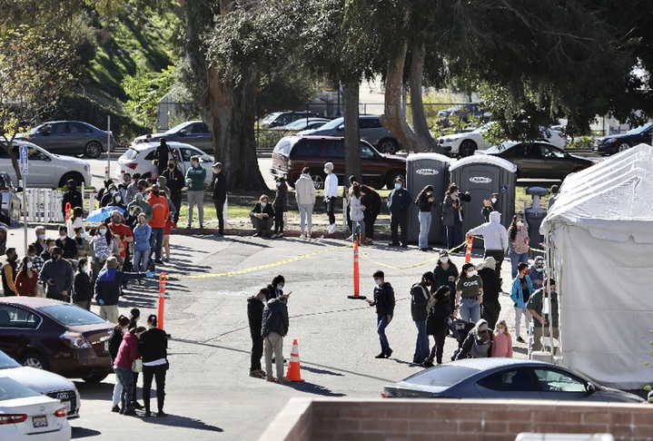↑2022年1月2日,人们在美国加利福尼亚州洛杉矶县的一处新冠病毒检测站排队等待检测。新华社发