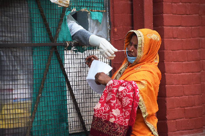 ↑2021年12月2日,一名女子在印度普拉亚格拉杰接受新冠检测。新华社发