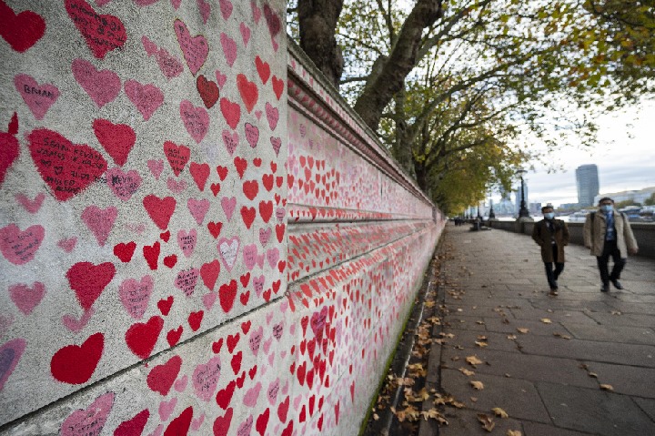 ↑2021年11月9日,人们经过英国伦敦泰晤士河沿岸的国家新冠纪念墙。新华社发(史蒂芬·程摄)