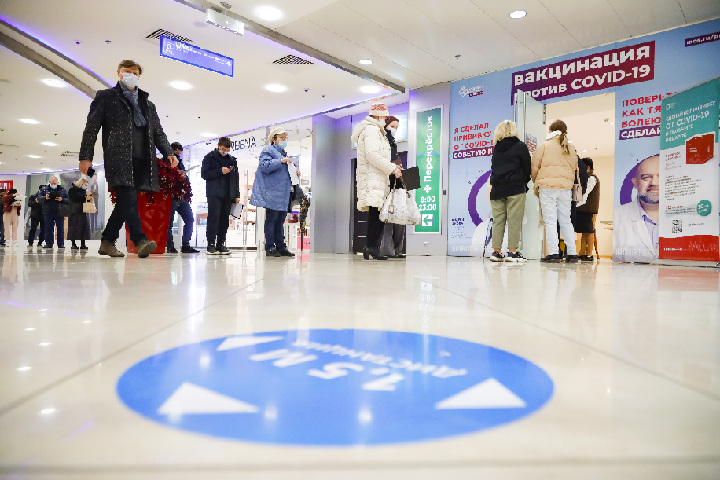↑2021年10月27日,市民在俄罗斯首都莫斯科的商场内排队等待接种疫苗。新华社发(亚历山大摄)
