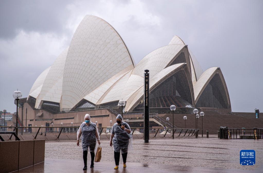 1月9日,两名女子在雨中走过澳大利亚悉尼歌剧院。