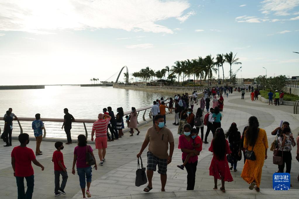 这是1月10日在斯里兰卡科伦坡港口城游艇码头区步行大道上拍摄的游客。