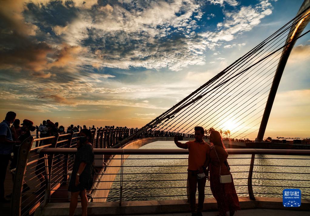 1月10日,人们在斯里兰卡科伦坡港口城游艇码头区的步行桥上观赏风景。