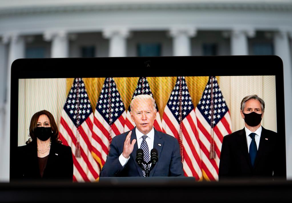 这张2021年8月20日拍摄的屏幕显示,美国总统拜登在华盛顿白宫就阿富汗局势发表讲话。(新华社记者刘杰摄)
