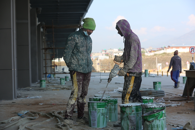 2022年1月11日,在尼泊尔中西部旅游胜地博卡拉,工人在博卡拉国际机场内施工作业。记者 周盛平 摄