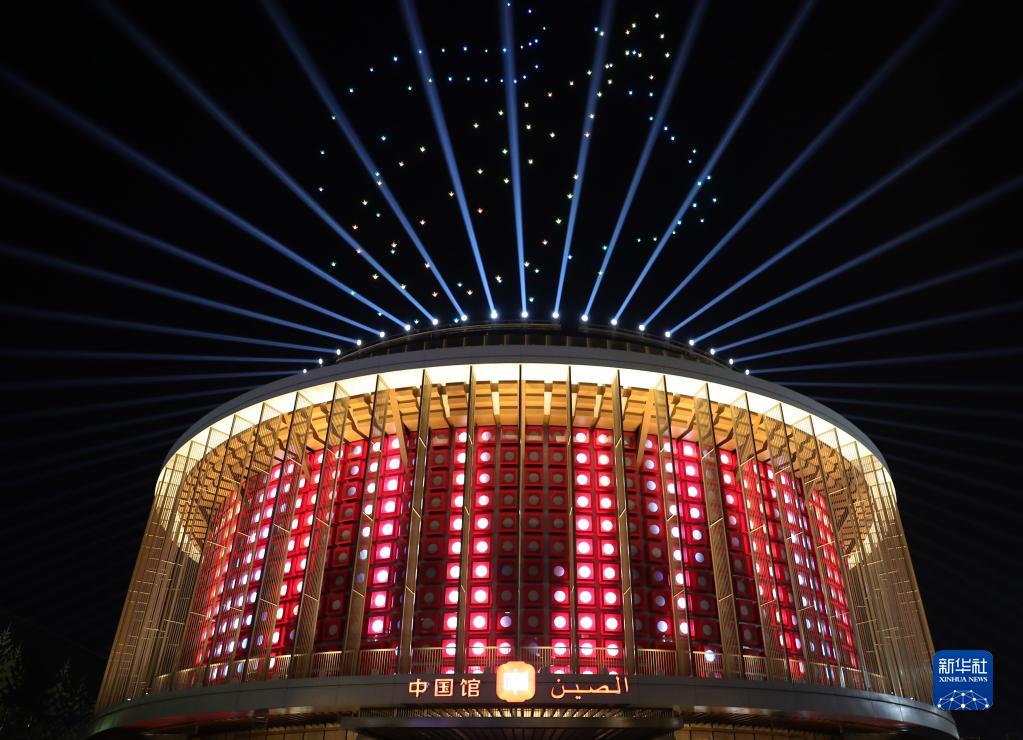 这是1月10日在阿拉伯联合酋长国迪拜世博会拍摄的中国国家馆日灯光秀。