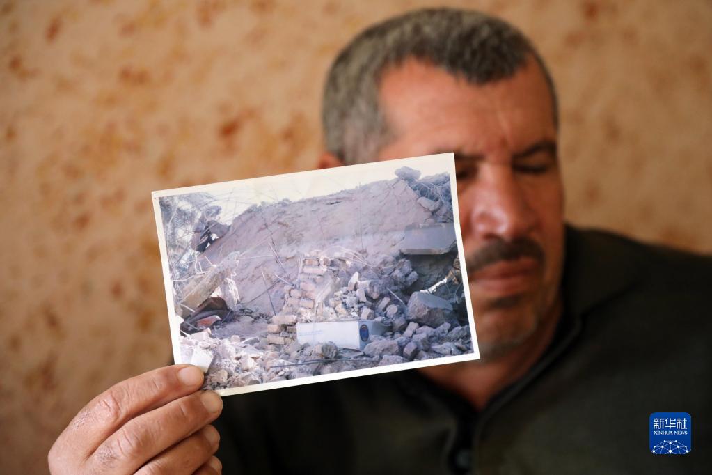 1月4日,在伊拉克萨拉赫丁省,易卜拉欣展示自家房屋被炸毁的照片。