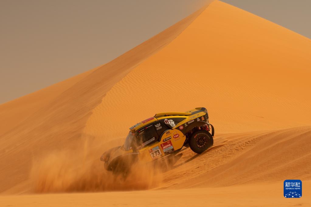 1月12日,韩魏赛车队车手田坡与领航员杜炫义驾驶273号赛车在沙漠中驰骋。