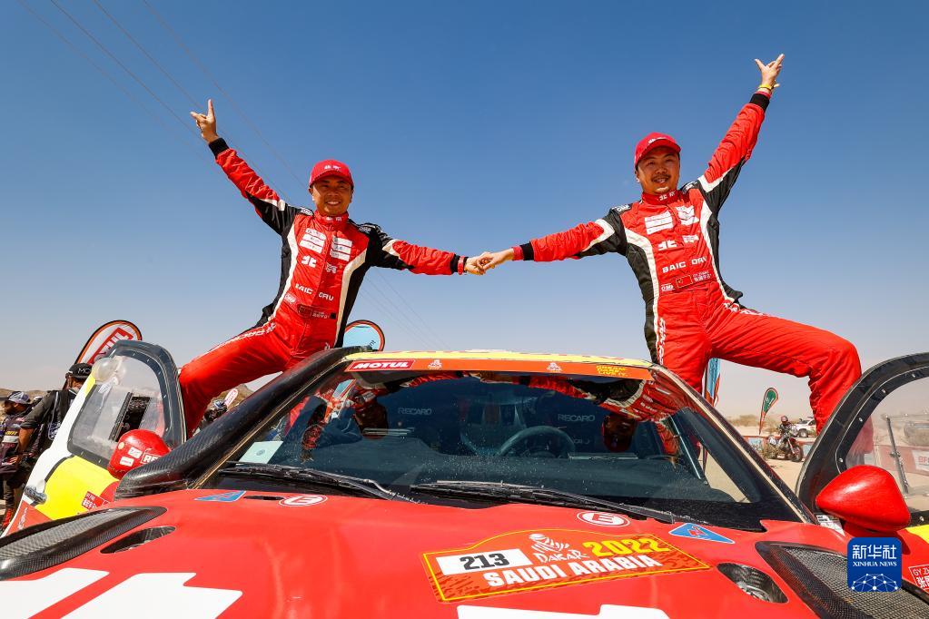 1月14日,北京越野车队车手张国宇(右)/潘宏宇在比赛终点庆祝完赛。