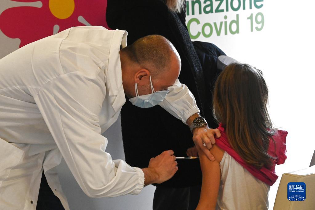 1月16日,一名儿童在意大利博洛尼亚一处新冠疫苗接种中心接种新冠疫苗。