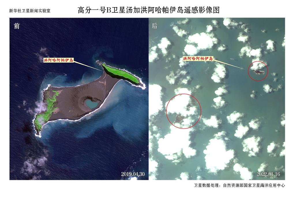 对比汤加火山喷发前后的卫星数据可看到,2019年4月30日,洪阿哈阿帕伊岛由两个小岛与火山岩组成;2022年1月16日,原来连在一起的火山岛变成了两个小岛,中间的火山岩变成了水域。