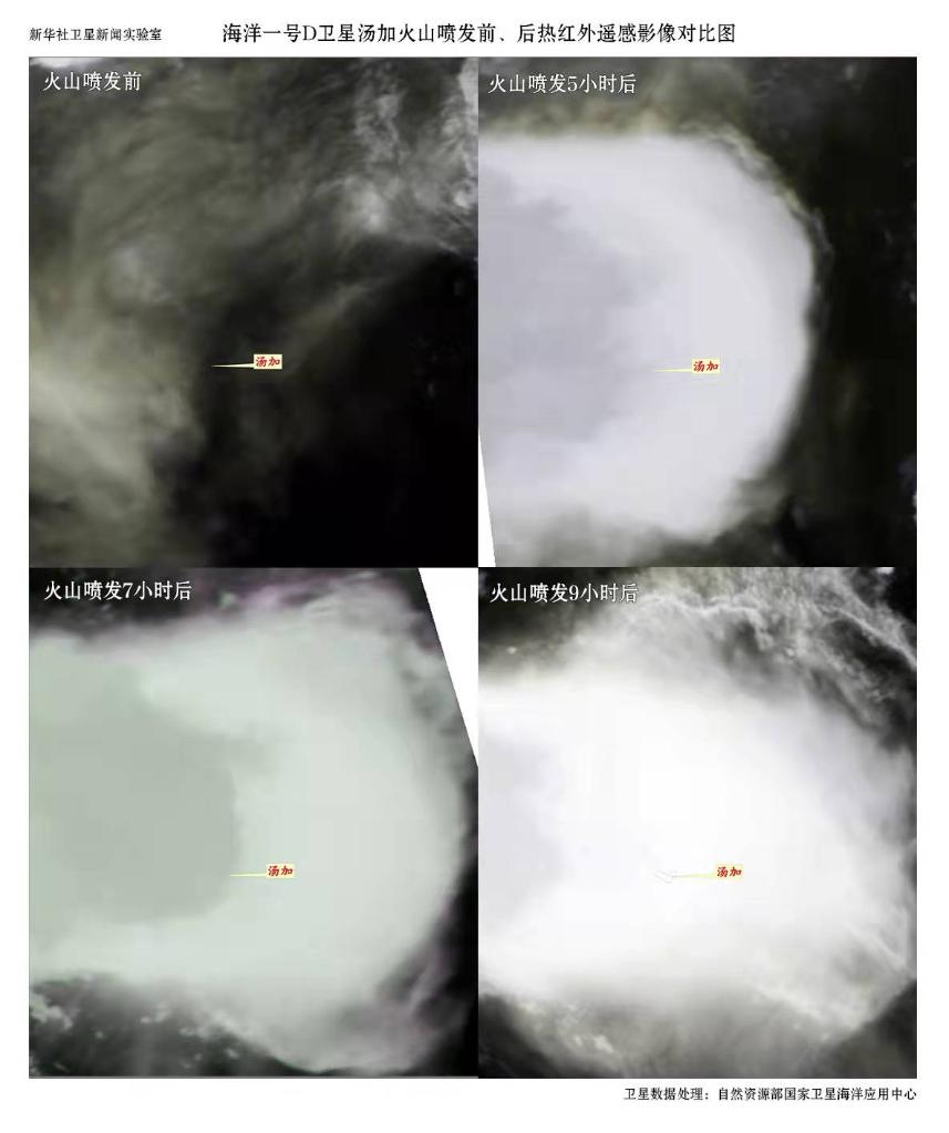 我国海洋一号C、D卫星拍摄到了汤加火山喷发前后的热红外云图。从中能看到火山喷发后扩散或残留在空中的火山云。火山喷发后5至9小时段内,火山云南北长度约400到600公里,东西长度上千公里,分布范围大,扩散较快,火山云系呈多层分布,反映其火山灰浓度不同。