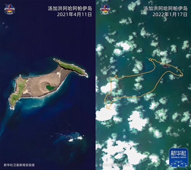 从卫星云图看,该岛火山喷发前后地形地貌发生了巨大变化。