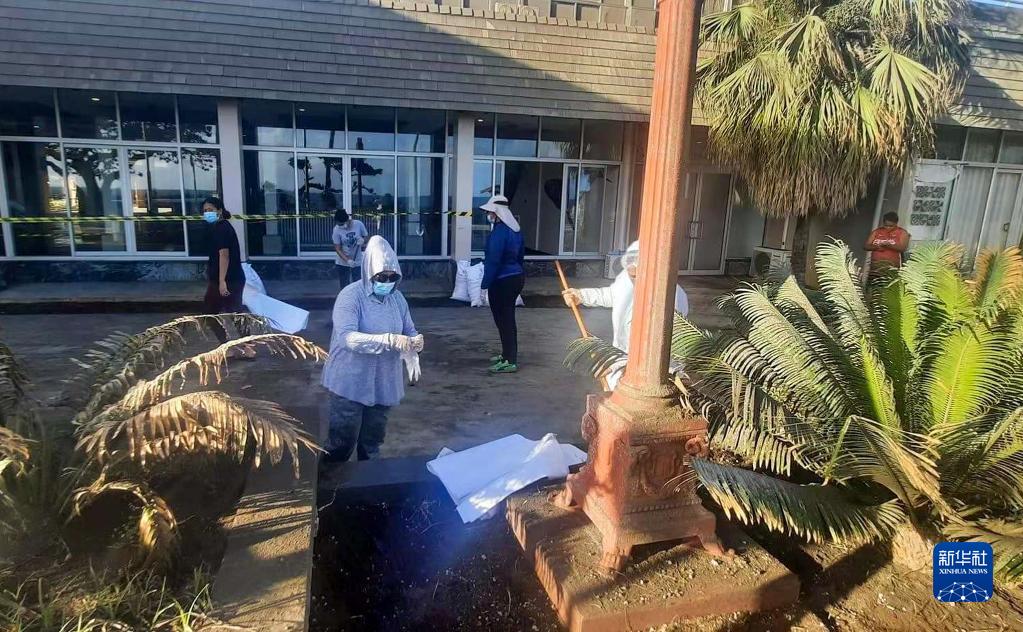 这是1月20日早晨在汤加首都努库阿洛法拍摄的遭受海啸侵袭后的街道和房屋。