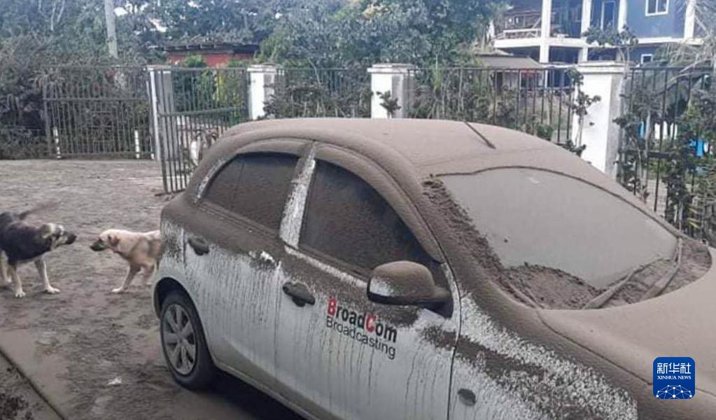 这是近日在汤加首都努库阿洛法拍摄的被火山灰覆盖的汽车。