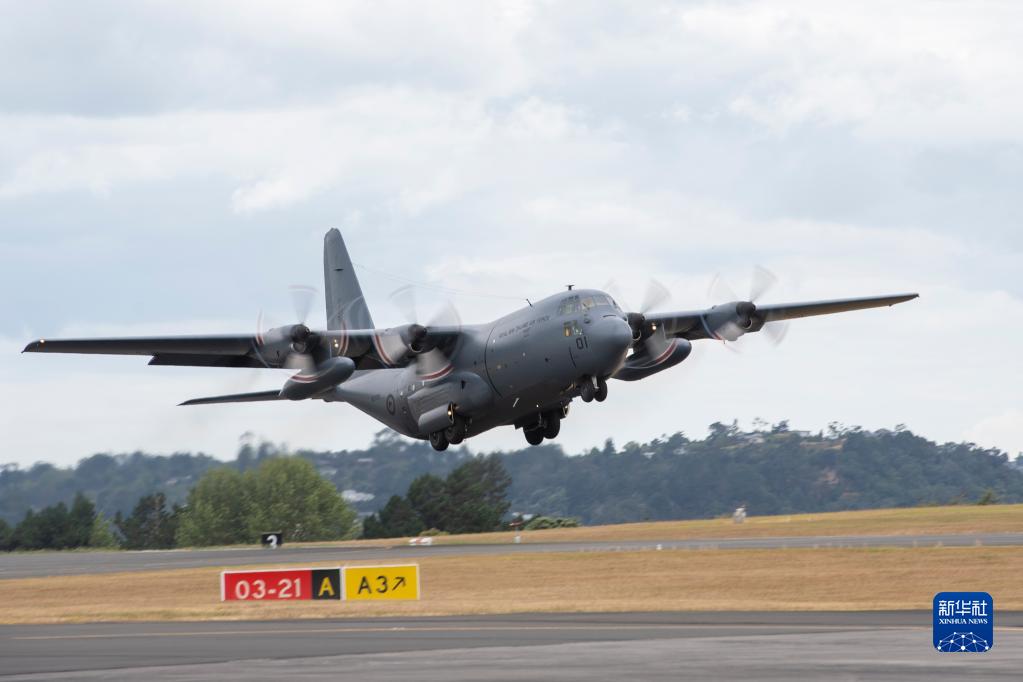 1月20日,一架运载救援物资的C-130运输机在新西兰奥克兰空军基地起飞,飞往汤加。