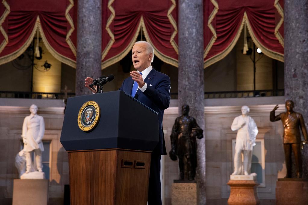 1月6日,美国总统拜登在华盛顿国会大厦发表讲话,纪念国会山骚乱事件一周年。(新华社发,Pool 图片,迈克尔·雷诺兹摄)