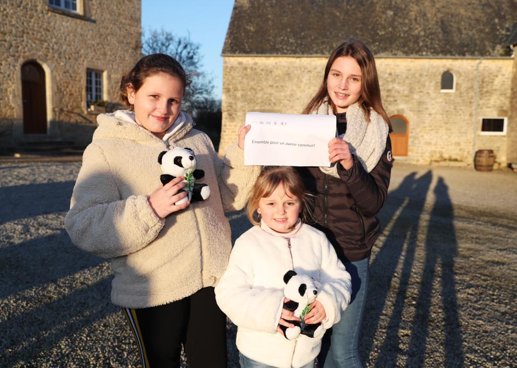 1月14日,在法国芒什省梅奥蒂市,10岁的安娜埃尔·玛丽昂、5岁的卡米耶·玛丽昂和12岁的诺拉·玛丽昂(从左至右)手举“一起向未来”的主题口号,祝福北京冬奥会。新华社记者 高静 摄