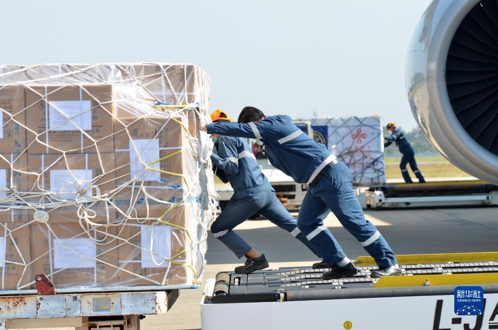1月25日,在老挝万象机场,工作人员搬运中国援助的新一批新冠疫苗。