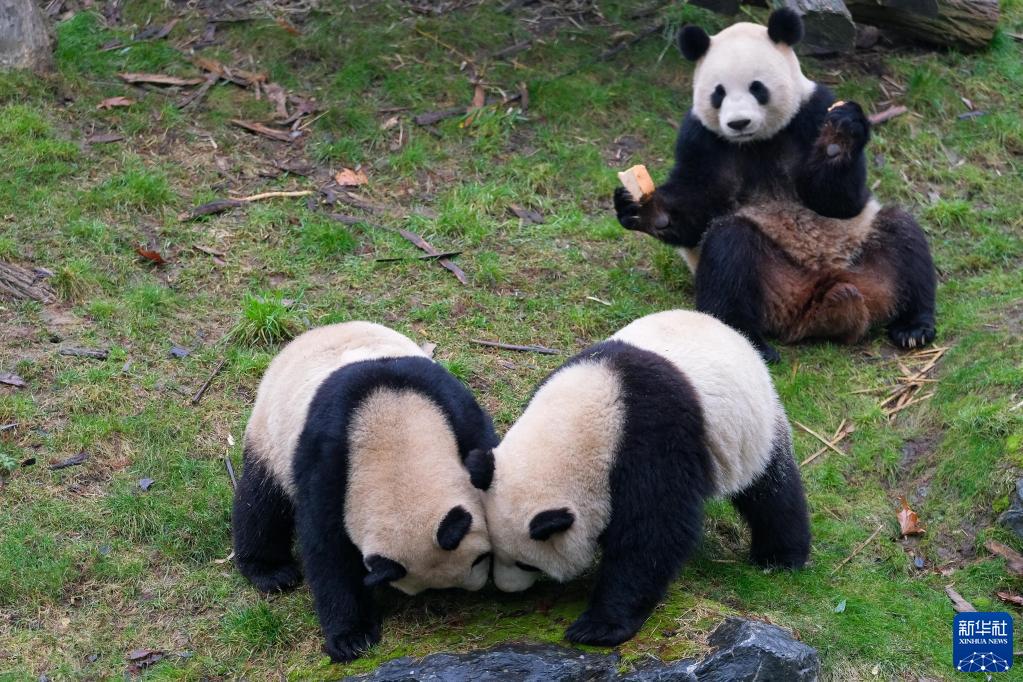 这是1月26日在比利时布吕热莱特天堂动物园拍摄的大熊猫“好好”(后)、“宝弟”(前右)和“宝妹”。