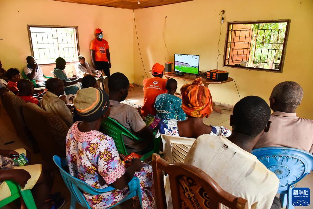 这是1月12日,在喀麦隆恩果阿邦村,村民通过“万村通”项目提供的电视机观看非洲杯。