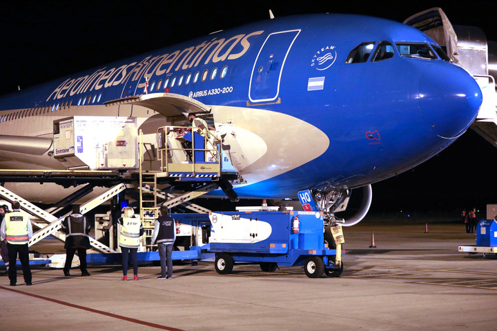 2021年4月1日,工作人员在阿根廷布宜诺斯艾利斯埃塞萨国际机场卸载运抵的中国新冠疫苗。新华社发(马丁·萨巴拉摄)