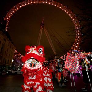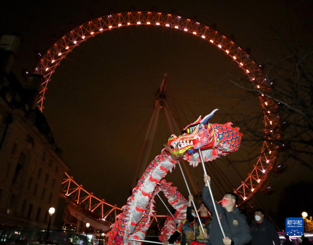1月28日,在英国伦敦,演员在亮起“中国红”的“伦敦眼”前表演舞龙。