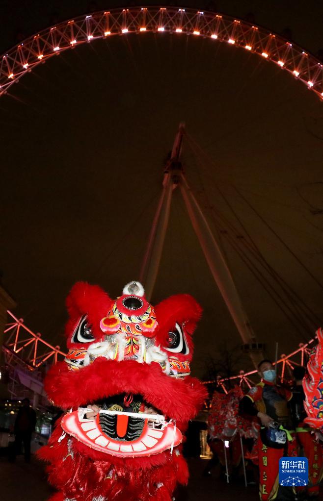 1月28日,在英国伦敦,演员在亮起“中国红”的“伦敦眼”前表演舞狮。