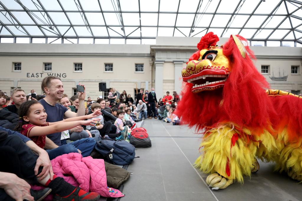 1月29日,人们在位于伦敦的英国国家海事博物馆与正在表演的“狮子”互动。当日,位于伦敦格林尼治区的英国国家海事博物馆举行中国春节庆祝活动。(新华社记者李颖摄)