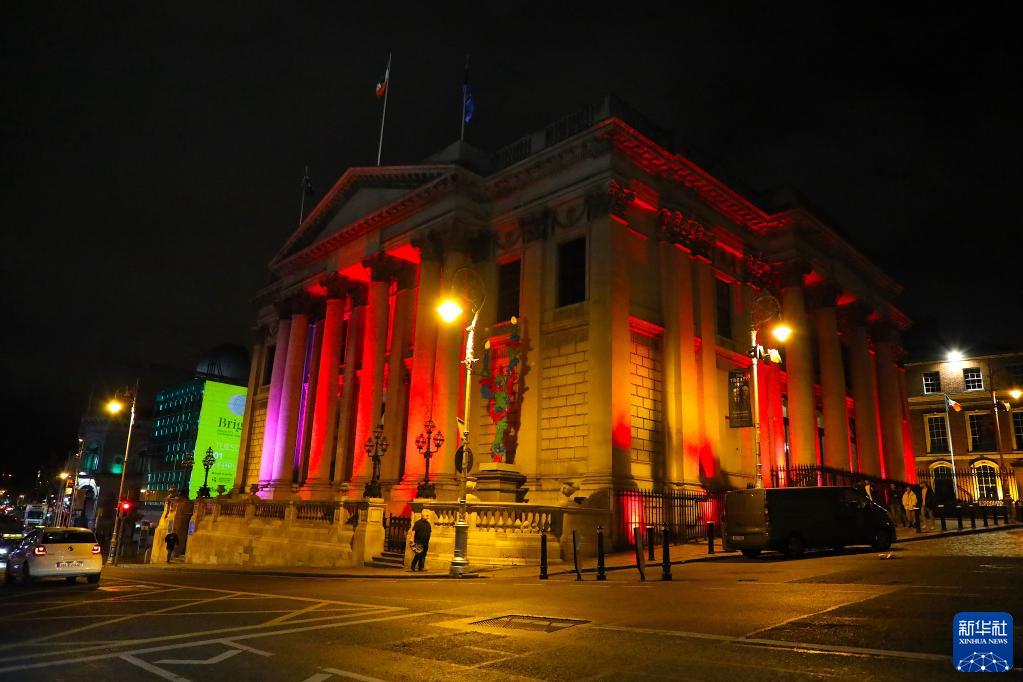 28日晚,爱尔兰首都都柏林多处标志性建筑物点亮中国红迎接农历新年。点亮中国红活动将持续到2月1日农历大年初一。