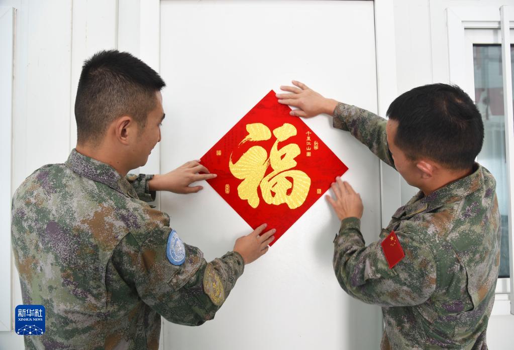 1月28日,中国第25批赴刚果(金)维和工兵分队官兵在营区贴福字。新华社发