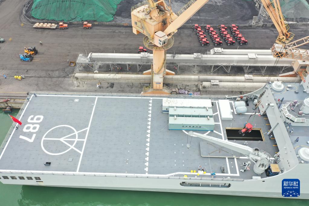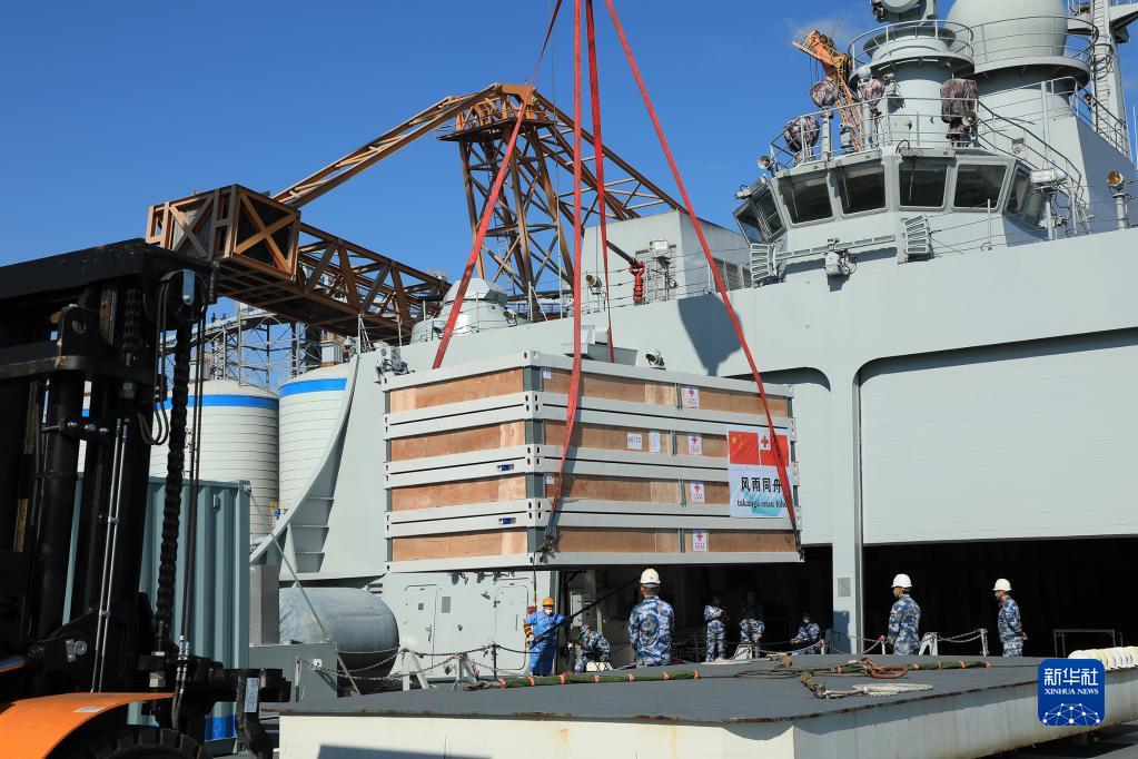 编队由南部战区海军两栖船坞登陆舰五指山舰和综合补给舰查干湖舰组成,装载救灾物资共计1400余吨,主要包括移动板房、拖拉机、发电机、水泵、净水器及应急食品、医疗防疫器材等物资。