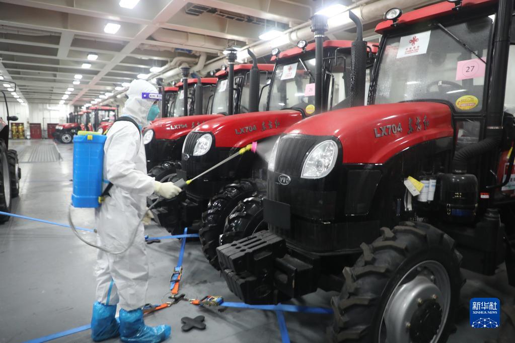 赴汤加执行运送救灾物资任务海上运输编队人员对救灾物资进行防疫消杀(1月28日摄)。新华社发(王磊 摄)