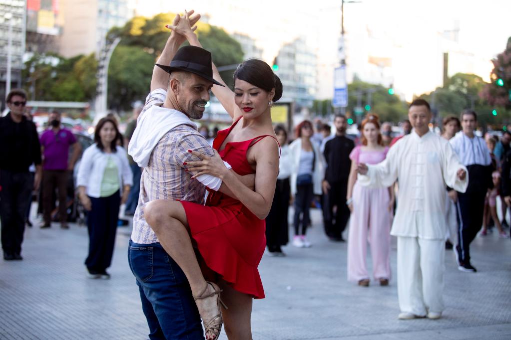 1月28日,在阿根廷布宜诺斯艾利斯,中阿舞者进行探戈表演。新华社发(马丁·萨巴拉摄)