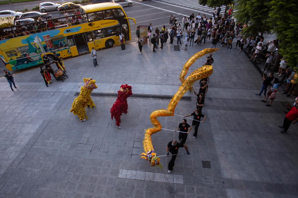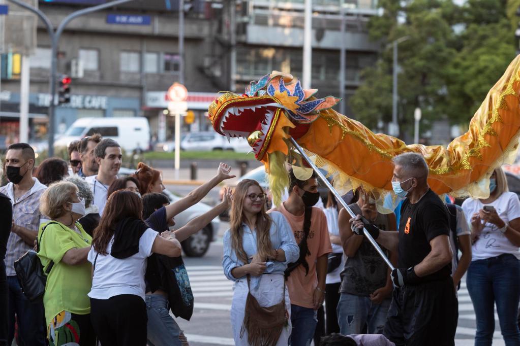 阿根廷的中华文化爱好者和华侨华人轮番上场,带来舞龙舞狮表演、腰鼓队表演和太极表演,吸引很多游客驻足观看,赢得阵阵掌声。